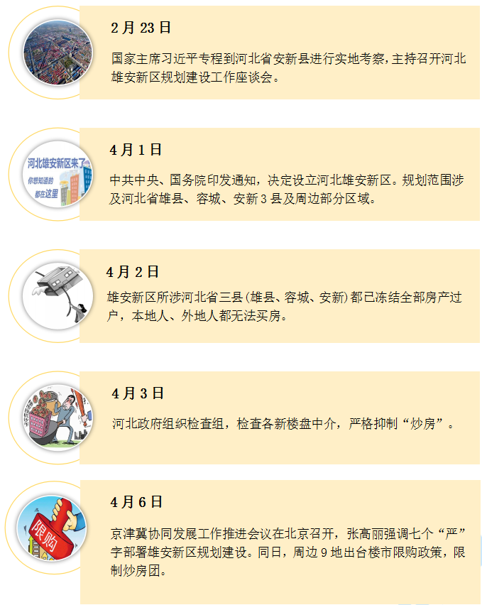 4月1日,“新华网”发文《中共中央、国务院决定设立河北雄安新区》,文称:中共中央、国务院印发通知,决定设立河北雄安新区。这是以习近平同志为核心的党中央作出的一项重大的历史性战略选择,是继深圳经济特区和上海浦东新区之后又一具有全国意义的新区,是千年大计、国家大事。
