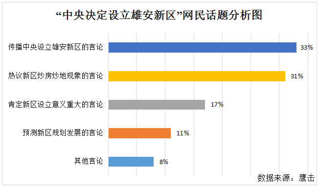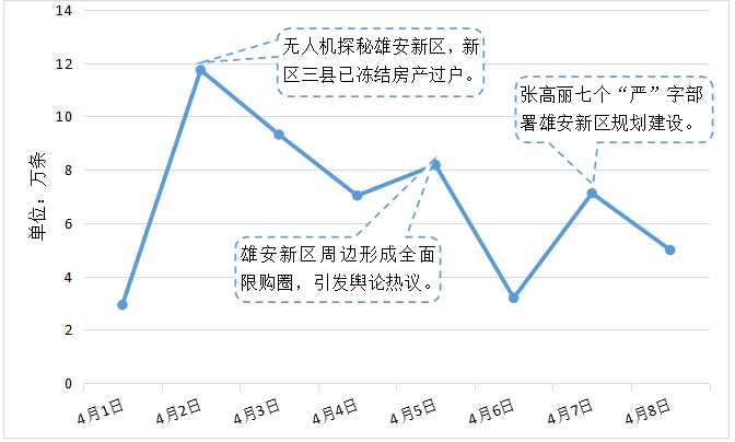2017年4月1日,据“新华社”报道:中共中央、国务院印发通知,决定设立河北雄安新区。新区的规划建设,迅速引发网民热议,人民网、新京报等多家媒体相继展开报道。4月2日,新区三县已冻结房产过户,随后河北政府组织检查组,各地出台限购政策,严格抑制“炒房”热,引发媒体和网民持续关注事件的发展。