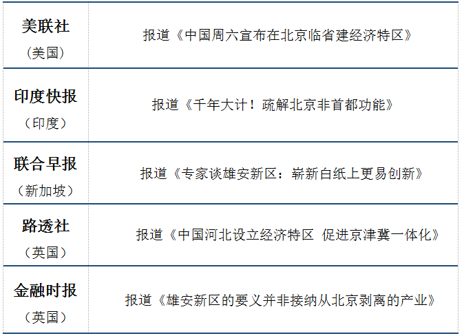 通过对互联网上境外主流媒体有关“中央决定设立雄安新区”的报道进行查看,发现主要报道来自“美联社”、“印度快报”、“联合早报”、“路透社”、“金融时报”等媒体。相关报道如下:
