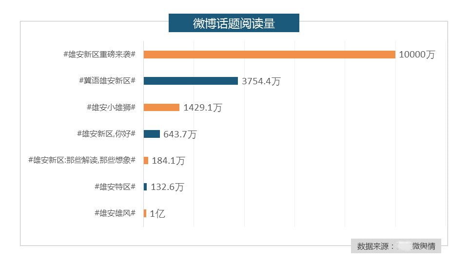 经分析,微博成为“雄安新区”相关事件的主要舆论传播平台,相关信息达153.9万条,占全部信息的63.57%。多个微博话题助推相关舆论发酵,截至目前,#雄安新区重磅来袭#、#雄安小雄狮#、#雄安特区#等阅读量合计超过1.6亿,其中#雄安新区重磅来袭#阅读量达1亿,讨论量达到4.5万条,位列各话题榜首。