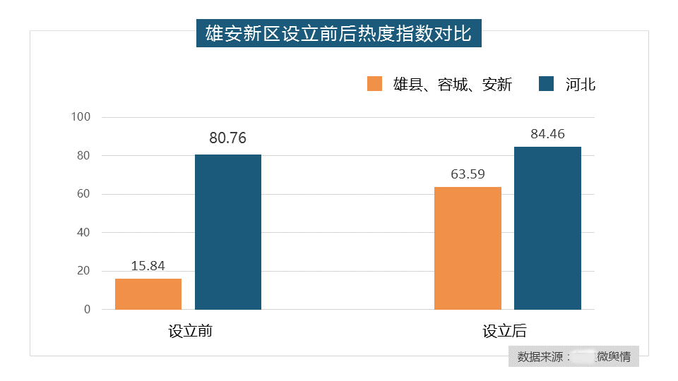 经分析,雄安新区的设立对提升当地网络关注度有巨大的促进作用。通过对雄安新区设立前一周(3月25日至3月31日)进行全网监测,雄县、容城、安新三县的信息总量仅有不足5万条(4.98万条)。而设立一周(4月1日至4月6日)相关雄安新区的信息总量达到88万条。相应地,雄安设立前后,当地网络传播热度指数也得到极大提升,从15.84到63.59,提升了4倍。对比雄安设立前后,河北省的网络传播热度指数从80.76到84.46,也有一定的提升。