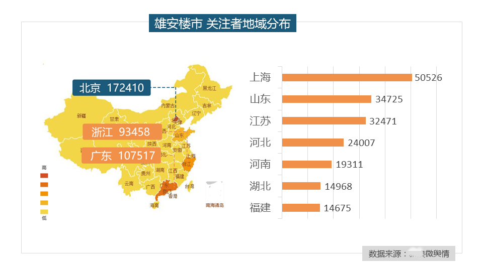 同时,经分析,来自北京的网友最为关注雄安楼市话题,共产生相关信息量17.2万余条,远超其他地域。很多媒体和专家也表示雄安新区的影响必定会对北京及周边城市的房价有所影响。例如:《新金融》杂志认为“雄安新区会从天津和北京抽走不少炒房资金,抽走不少单位和居民,给这两座直辖市火热的房市釜底抽薪,减少了刚性住房需求,这必然会给京津两地的房市降温。”易居研究院智库中心研究总监严跃进则认为“雄安新区的建设从实质性影响来看,对于北京南部区域影响会比较大。后续结合大兴机场的概念,类似礼贤镇、榆垡镇等相对受影响会比较大,成为承接雄安新区到北京市区资源导入的一个重要区域。”