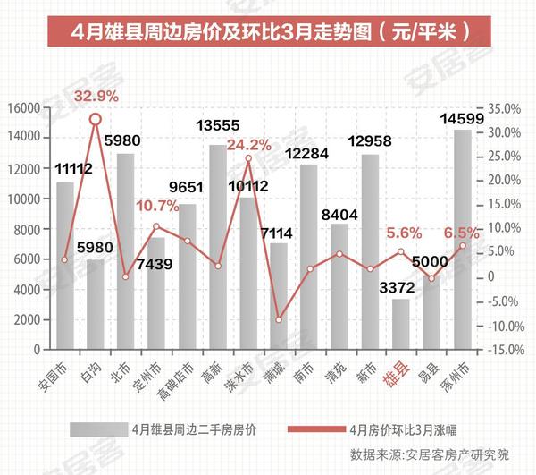 但在雄安新区无房可买的炒房者,并没打道回府,他们迅速将视线投向了新区辐射区。据媒体报道,房地产投资热潮在清明节期间就已蔓延至任丘、白沟、高碑店、霸州等“环雄城市”。根据安居客相关数据显示,自新区规划公布之后,雄安周边地区房价涨幅惊人。白沟4月房价环比3月增长32.9%,涞水县环比增长率24.2%,定州市环比增长10.7%。