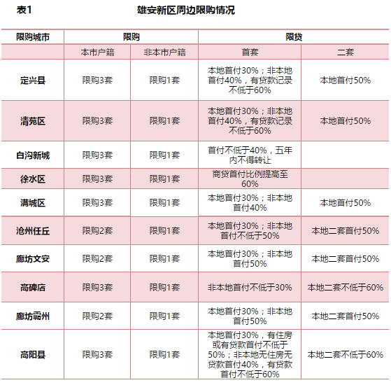 房价被爆炒的后果,自然是引发严格的管控。截至4月5日深夜,与雄安新区三县紧邻的河北省廊坊市霸州市、文安县;沧州市任丘市;保定市徐水区、定兴县、满城区、清苑区、白沟新城、高碑店市、高阳县等十个地区接连出台限购措施,形成“环雄限购圈”,开始封堵各种炒房行为。