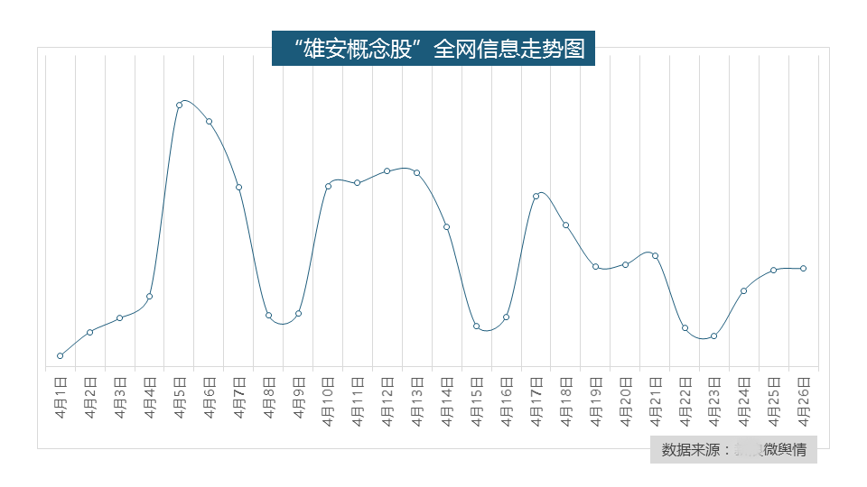 4月5日,沪深两市双双高开,其中雄安概念股领涨,助推了A股开盘的雄起。环球网、中国新闻网等媒体纷纷报道,推动该事件网络传播到达顶峰。4月6日,根据《北京晨报》的报道,除了雄安概念股之外,“河北板块的个股几乎全线涨停。带动一带一路、建材、人工智能等板块跟随崛起”。与A股不同,据《深圳商报》的报道,港股相关概念股却“表现疲弱”。4月8日、9日,股市休市,相关雄安概念股信息量急剧下滑。4月10日开市后,信息量又开始暴涨,到4月11日,在A股持续上涨的雄安概念股再次迎来引爆点,达到第二个舆论高峰,并持续火爆直至周六休市。