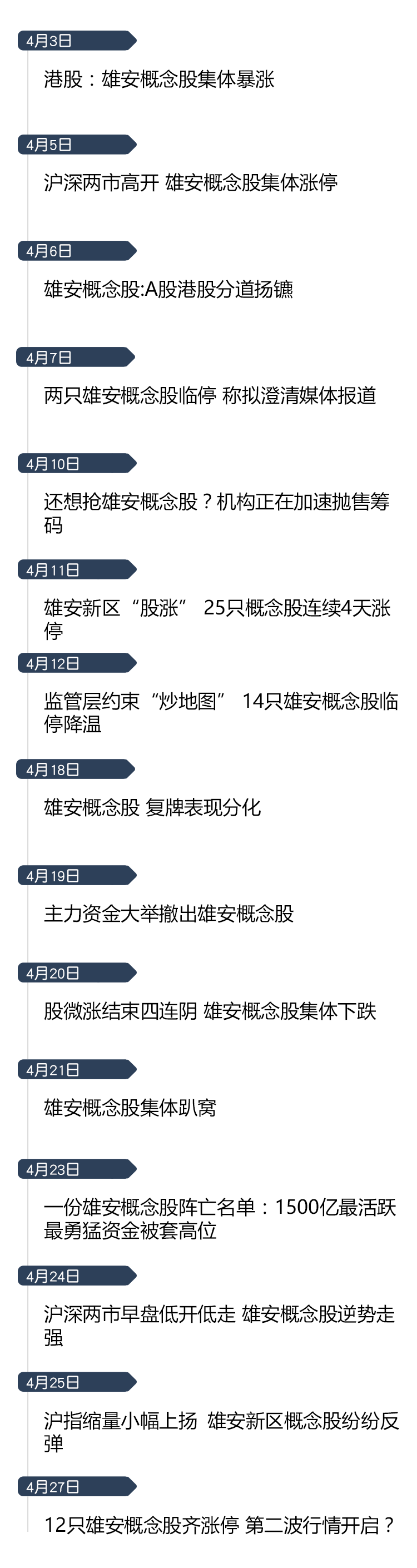 此时,越来越多的媒体开始预警风险,监管部门也开始出手约束。4月12日晚间,共有14只概念股上市公司发布公告,宣布自4月13日开市起开始停牌,展开自查工作。4月17日,临停的雄安概念股复牌后,多只股票出现跌停。4月20日,前期遭到炒作的雄安概念股集体下跌。3天后,有媒体报道用“冰火两重天”、“生死时速”形容雄安概念股在股市的表现,甚至有网友整理了“一份雄安概念股阵亡名单”,并称“1500亿最活跃最勇猛资金被套高位”。然而到25日股市再次开市,雄安概念股开始反弹。有消息称这是因为“机构再度买入”,媒体纷纷用“第二波”、“第二弹”、“第二波”来形容雄安概念股的复苏。