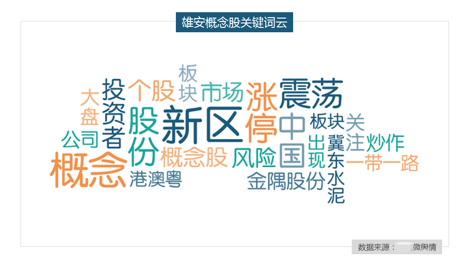 同时,通过对“雄安概念股”相关关键词进行分析,可以发现“概念”、“概念股”、“新区”、“龙头”、“个股”等词汇在网络传播过程中出现频率最高。从“涨停”、“涨幅”、“上涨”、“炒作”、“震荡”、“分化”等热词,能看出网友对此的关注点。此外,一些表现抢眼的“雄安概念股”也出现在关键词云中,比如“金隅股份”、“冀东水泥”等。