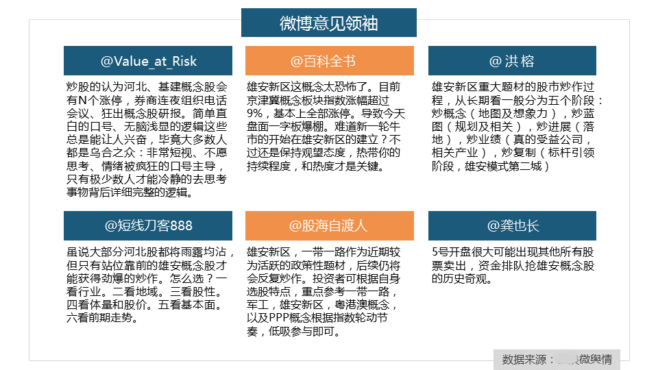 对于“雄安概念股”,多数专业人士给股民以投资建议。例如,上海大智慧股份有限公司微博签约自媒体@洪榕认为“雄安新区重大题材的股市炒作过程,从长期看一般分为五个阶段:炒概念、炒蓝图、炒进展、炒业绩、炒复制”。还有微博股评团成员财经博主微博头条文章作者@股海自渡人,建议“投资者可根据自身选股特点,重点参考一带一路,军工,雄安新区,粤港澳概念,以及PPP概念根据指数轮动节奏,低吸参与即可。”同时,一些专业人士也对其中的风险进行警示,呼吁人们理智对待。例如,杭州星瀚投资管理有限公司投资总监微博股评师微博头条文章作者@Value_at_Risk ,认为“毕竟大多数人都是乌合之众:非常短视、不愿思考、情绪被疯狂的口号主导,只有极少数人才能冷静的去思考事物背后详细完整的逻辑。”