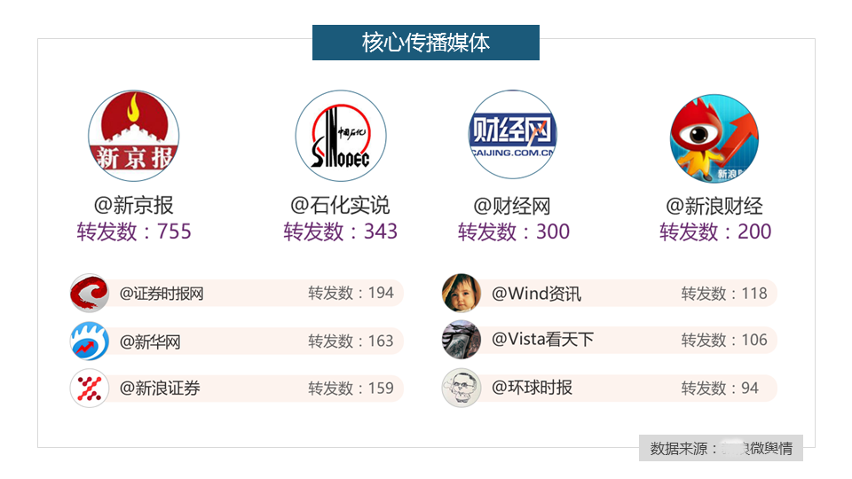 主流媒体的官方微博对“央企支持雄安建设”进行积极传播,@新京报、@石化实说、@财经网等均成为微博核心传播媒体。其中@新京报发布的题为《国资委:已有至少31家央企表态支持雄安新区建设》的文章转发量为755次,相对较为突出。
