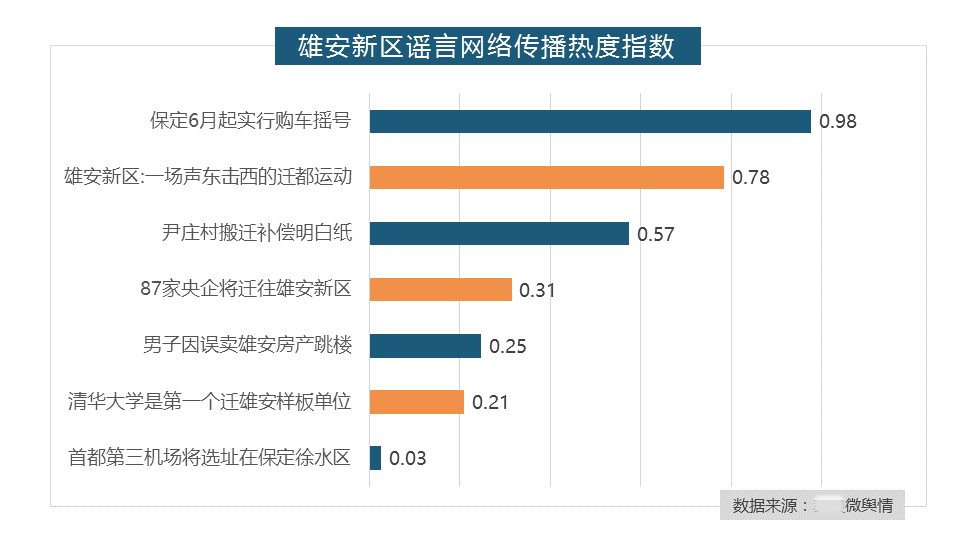 4月2日,在雄安新区设立次日,网上就出现一篇题为“雄安新区:一场声东击西的迁都运动”。此后,“清华大学搬迁雄安”、“87家央企迁往雄安”、“保定实行购车摇号”等谣言陆续在网络上扩散。经分析,在监测时段内,“保定6月起实行购车摇号”相关消息的热度指数最高。