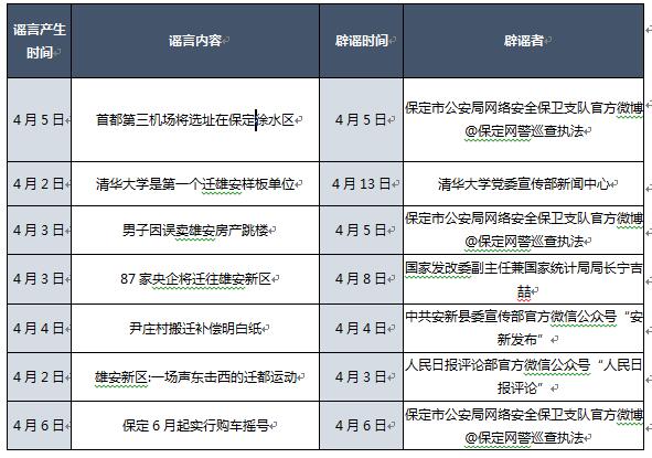 在谣言产生之后,相关部门第一时间进行辟谣。例如,4月3日,“男子因误卖雄安房产跳楼”相关消息在网上流传后,4月5日,保定市公安局网络安全保卫支队就通过官方微博@保定网警巡查执法公布真相,及时辟谣。当地警方还对传播不实图文信息的杨某某处以行政拘留10日的处罚。4月6日,“保定6月起实行购车摇号”相关谣言产生后,当天@保定网警巡查执法就进行辟谣。
