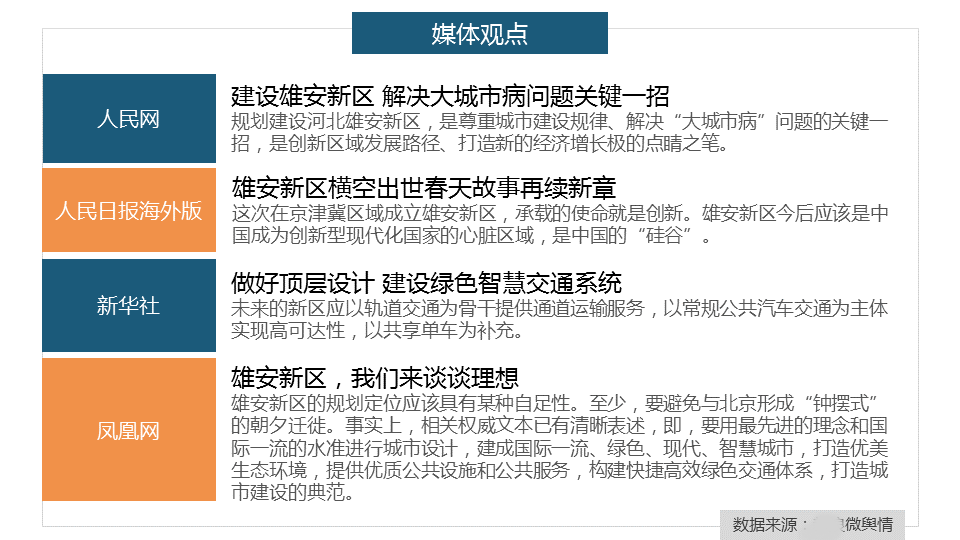 除了积极辟谣,主流媒体还发布关于雄安新区的设立重大政策和解读的新闻,有效设置议题,正面引导舆论。例如,4月1日,设立雄安新区消息公布当天,人民网发布评论文章《建设雄安新区解决大城市病问题关键一招》,称雄安新区建立是具有重大现实意义和深远历史意义的战略性选择,对雄安的定位是“千年大计、国家大事”。3日,人民日报海外版发表文章《雄安新区横空出世春天故事再续新章》,其中采访了国家发改委学术委员会研究员、中国国际经济交流中心首席研究院张燕生,谈到“雄安新区今后应该是中国成为创新型现代化国家的心脏区域,是中国的‘硅谷’。”4日,凤凰网评论部也以“雄安新区,我们来谈谈理想”为题,谈了雄安新区的规划定位,认为“雄安新区的规划定位应该具有某种自足性。至少,要避免与北京形成“钟摆式”的朝夕迁徙”。