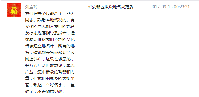 大家积极主动出谋划策,新区党工委副书记、管委会常务副主任刘宝玲也在“雄安发布”留言表示,近期新区将根据雄安本地的文化传承建立地名库,所有的地名、建筑物等名称,都要在网上进行公布,并逐级征求意见,集中群众的智慧和力量,把雄安的大街小巷名字起好,一旦依法确定就不得随意更改。