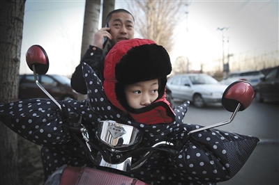11月24日,安新县端村。下学后,新鲜坐着爸爸的电动车回家。摄影/新京报记者 尹亚飞
