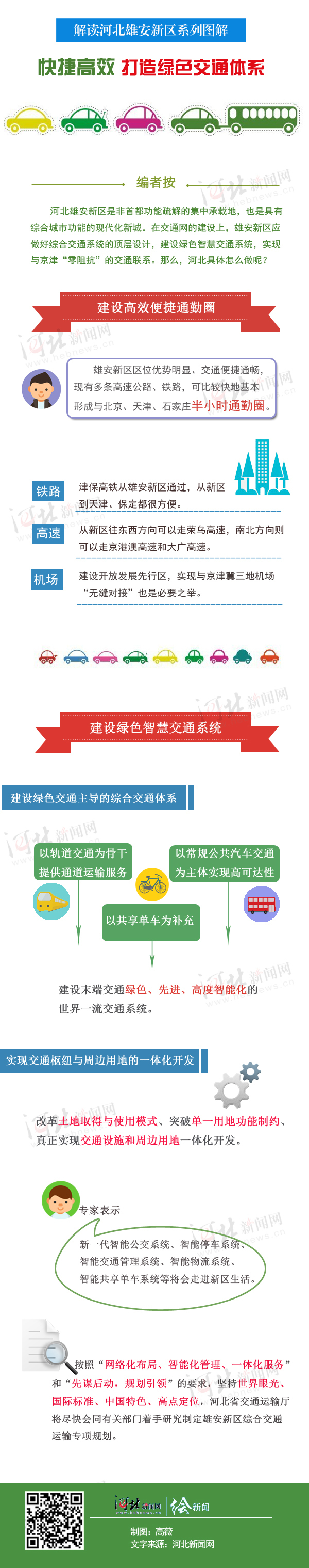雄安新区是非首都功能疏解的集中承载地,也是具有综合城市功能的现代化新城,是京津冀协同发展的“发动机”之一。相关专家认为,为避免重蹈“现代城市病”之覆辙,在交通网的建设上,雄安新区应做好综合交通系统的顶层设计,建设绿色智慧交通系统,实现与京津“零阻抗”的交通联系。