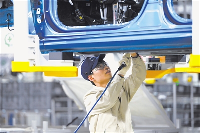 2017年2月21日,在位于沧州的北京现代沧州工厂生产车间内,工人们在组装车身部件。北京现代落户沧州,带动了该市整个汽车产业发展。(资料图片) 记者 陈建宇摄