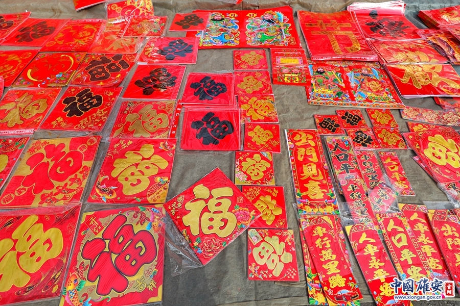 各式各样的福字和春联成了年货摊上的热销品。 毛鹤然/图 张鹏/文