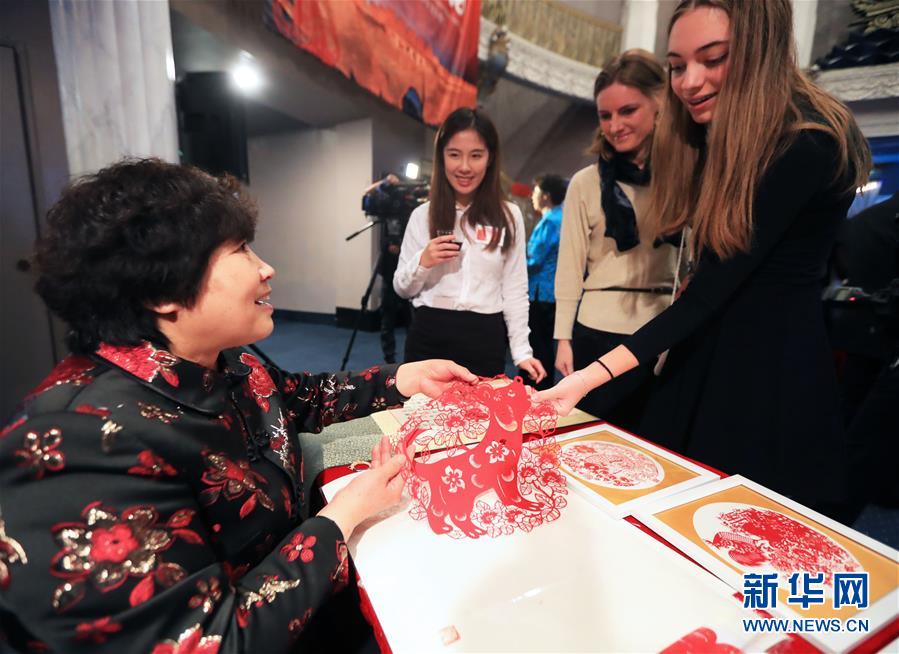 2月10日,在美国洛杉矶县贝弗利山市“欢乐春节·魅力京津冀”活动上,剪纸艺术家、丰宁满族剪纸传承人石俊凤(左)展示剪纸作品。