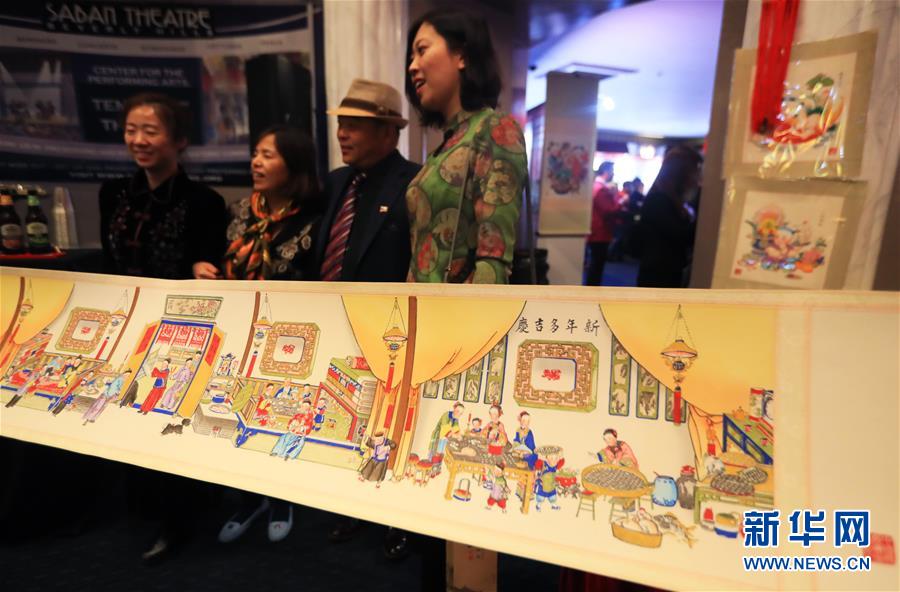 2月10日,在美国洛杉矶县贝弗利山市“欢乐春节·魅力京津冀”活动上,人们与木版年画合影。
