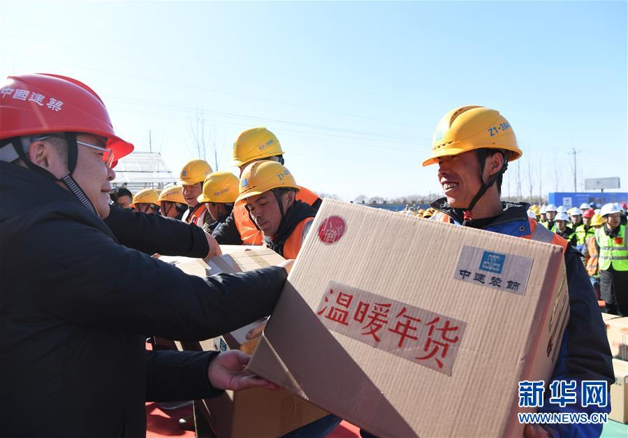 2月12日,在雄安市民服务中心项目现场举行的“雄安建设者幸福过大年活动”上,工人们领到新春慰问品——“年货大礼包”。当日,“雄安建设者幸福过大年活动”在雄安市民服务中心项目现场举行,中建装饰集团为坚守在岗位上的建设者们带来新春慰问品,并设立“小确幸”移动照相馆,工人随时可以进入移动照相馆,在新年的雄安定格下一张有着特殊意义的纪念照,并通手机扫描二维码下载照片,传递给亲人,分享快乐。新华社记者 申宏 摄