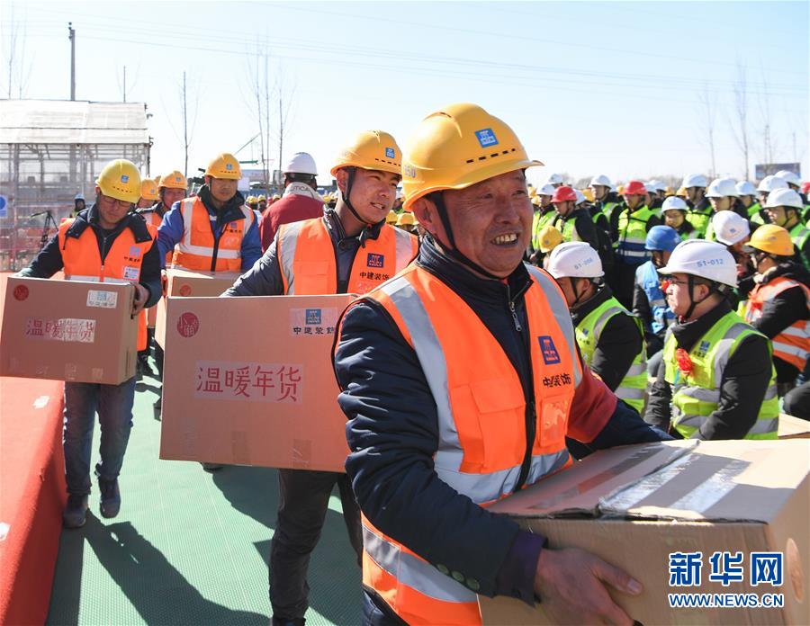 2月12日,在雄安市民服务中心项目现场举行的“雄安建设者幸福过大年活动”上,工人们领到新春慰问品——“年货大礼包”。当日,“雄安建设者幸福过大年活动”在雄安市民服务中心项目现场举行,中建装饰集团为坚守在岗位上的建设者们带来新春慰问品,并设立“小确幸”移动照相馆,工人随时可以进入移动照相馆,在新年的雄安定格下一张有着特殊意义的纪念照,并通手机扫描二维码下载照片,传递给亲人,分享快乐。新华社记者 申宏 摄