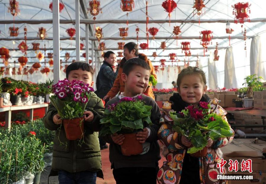 2月12日,腊月二十七,河北雄安新区即将迎来设立之后的首个春节。雄安三县街头的民众们买年货、挂灯笼、逛花市热闹非凡。图为雄县民众带孩子逛花卉市场。 中新社记者 韩冰 摄
