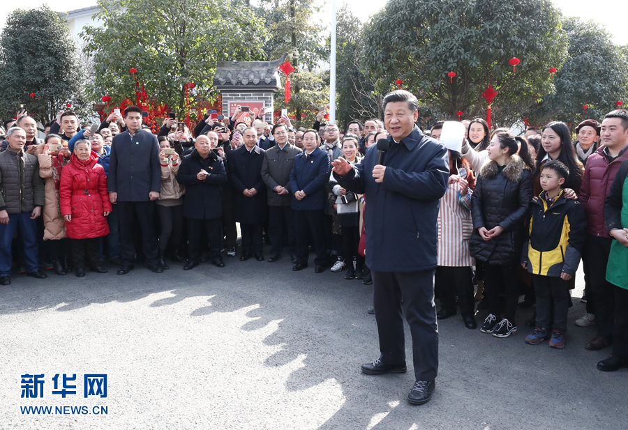 中华民族传统节日农历春节来临之际,中共中央总书记、国家主席、中央军委主席习近平来到四川考察调研,看望慰问各族干部群众,向全国各族人民致以美好的新春祝福。这是2月12日上午,习近平在成都市郫都区战旗村考察时向群众拜年,祝愿全国各族人民新春快乐、阖家幸福。 新华社记者 鞠鹏 摄