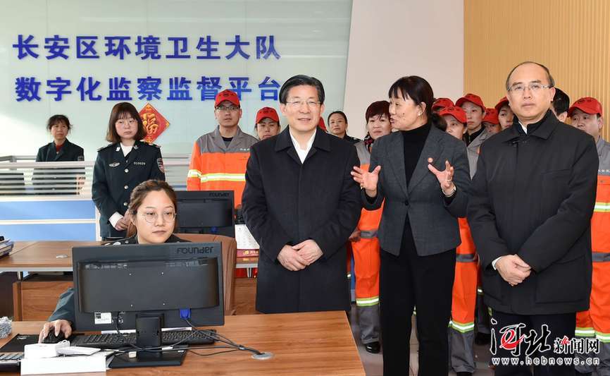 2月13日下午,省委书记、省人大常委会主任王东峰,省委副书记、省长许勤走访慰问省会一线干部职工和科技工作者。这是王东峰、许勤在石家庄市长安区环境卫生大队看望慰问环卫职工,通过数字化信息平台了解环卫车辆作业情况。记者赵威摄