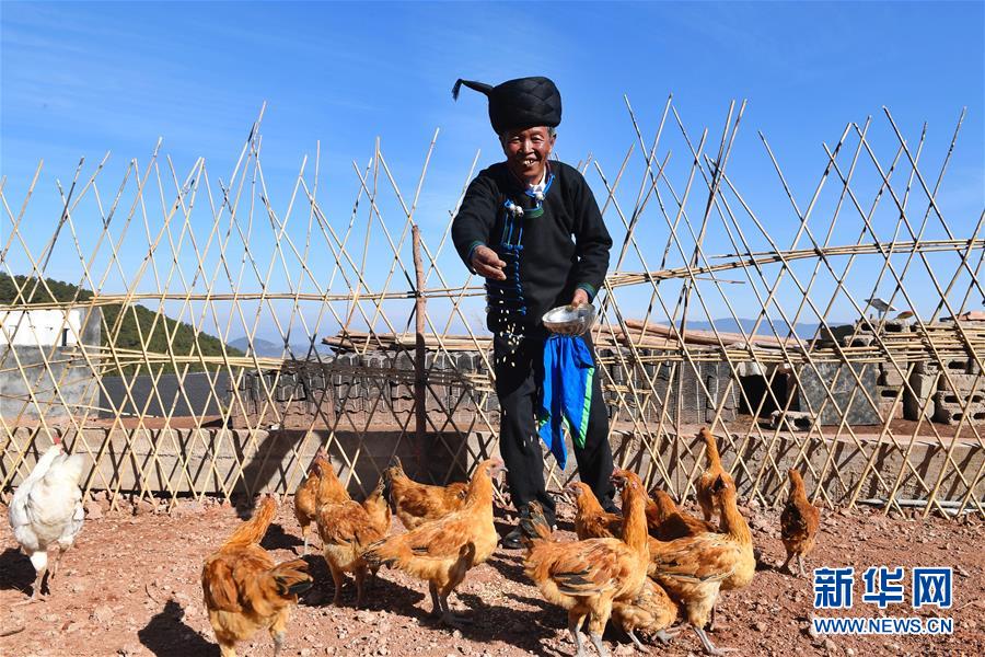 2月11日,四川凉山彝族自治州昭觉县解放乡火普村村民吉地尔子在喂鸡。 新华社记者 刘坤 摄