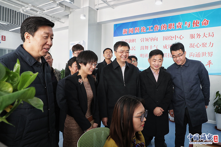 在超级编辑部演播室,陈刚询问春节期间的访谈和直播工作安排,到导播间看直播演练。当听到官网工作人员汇报,在雄安新区网络安全和信息化领导小组办公室与新华社、新华网的共同努力下,官网将实现“政务属性、媒体属性、社交属性”三位一体,“移动化、视频化、国际化”三化并举,“网站、电视、广播、报纸”四媒合一时,陈刚为官网建设工作坚持“创新、超越、引领”理念和取得的扎实成效点赞。