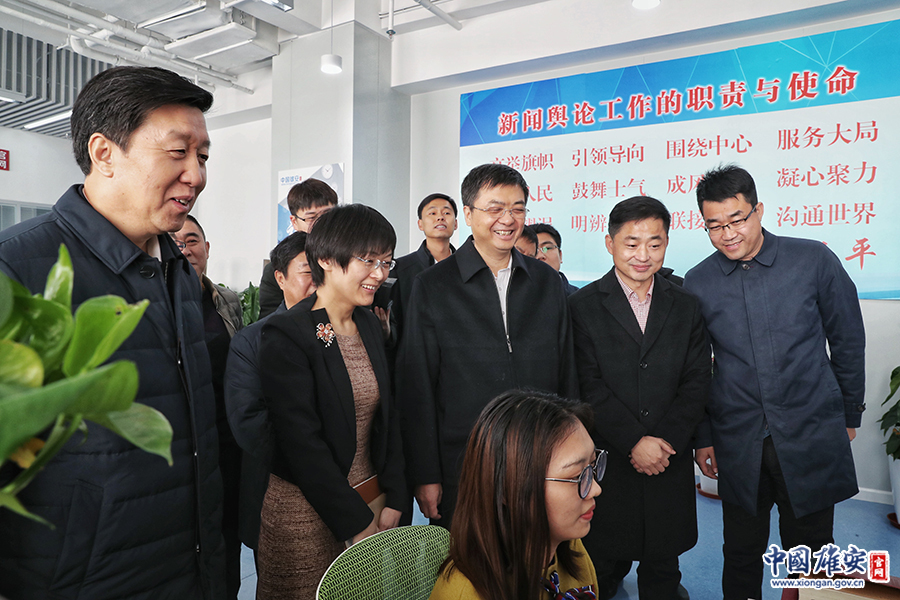 图为陈刚、刘宝玲一行在中国雄安官网超级编辑部。毛鹤然/摄