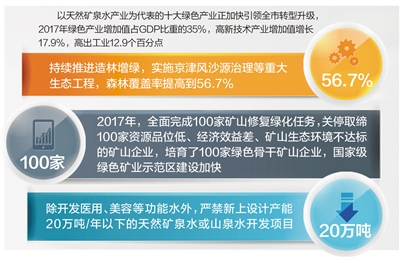 日前,承德矿泉水文化博物馆正式落成,一件件实物、一幅幅图片生动讲述着人类保护水、开发水、发展水的历程。这座国内唯一非企业性质运营的矿泉水文化博物馆,加上之前建成的中国高锶康养矿泉水院士专家工作站、中国高锶康养矿泉水研究院等,将为承德建设“中国高锶矿泉城”提供强力支撑。目前,以天然矿泉水产业为代表的十大绿色产业正加快引领全市转型升级,2017年绿色产业增加值占GDP比重的35%,高新技术产业增加值增长17.9%,高出工业12.9个百分点。