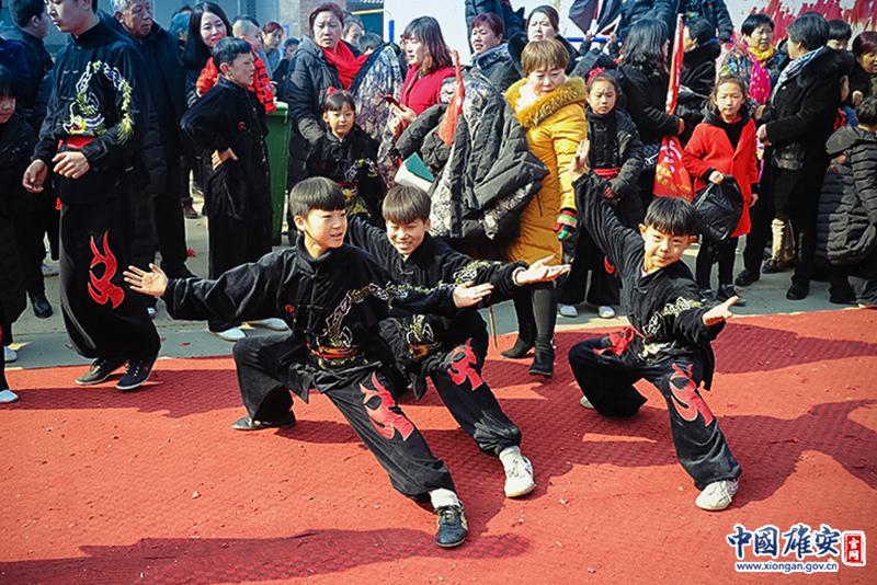 赵北口少林老会上,小演员孙子凯(前排左一)、李佳泽(前排中)、尚韵涛(前排右一)三人齐亮相。 刘东尧/图 刘琪/文