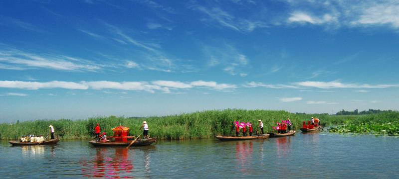 白洋淀诸多渔村四面环水,渔民的交通工具是船,这里最具特色的是迎亲彩船。鲜红的花轿放在船头,大队盛装的迎亲队伍,长长的一列恭候着,布满整个水淀,成为淀区一道艳丽的风景线。 朱昆仑/图 刘琪/文