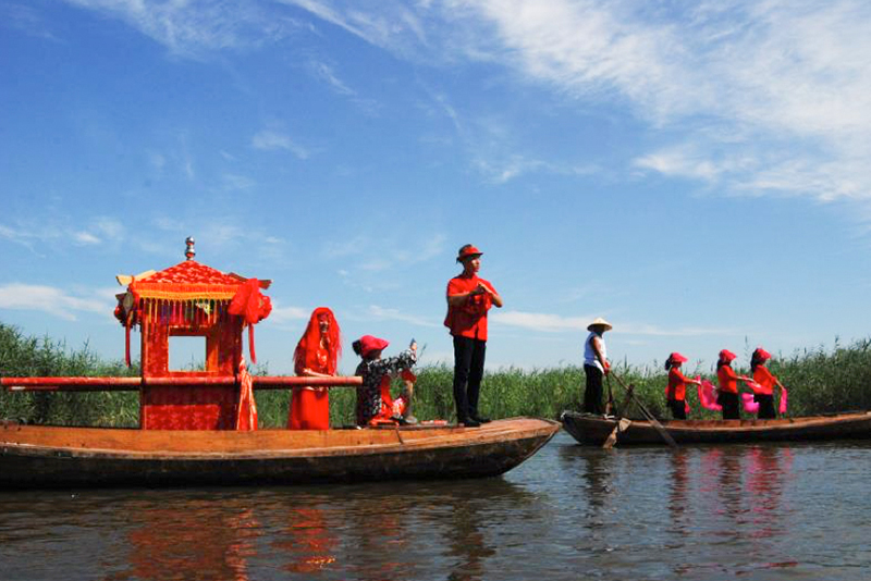 蓝天下,碧波上,新郎在亲友见证下迎娶新娘。 朱昆仑/图 刘琪/文