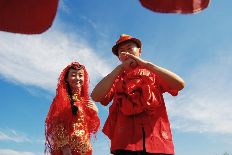 新娘脸上洋溢着幸福的笑容,新郎拱手作揖。 朱昆仑/图 刘琪/文