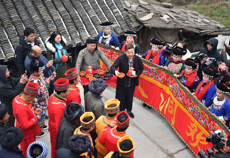 2018年2月4日,在湖南省湘西土家族苗族自治州花垣县十八洞村,新郎的迎亲队伍遇上新娘亲友拦门。当日,两对分别来自湘西和湘潭的新人特地来到十八洞村体验苗族婚礼。新华社发(薛宇舸 摄)