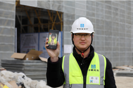 2月20日,孙梁在雄安市民服务中心项目工地上用手机展示自己女儿的照片。(朱兴鑫 摄)