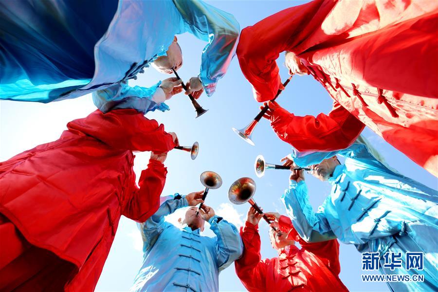 2月28日,在江西省靖安县香田乡白露村,民俗表演队在吹奏乐器。