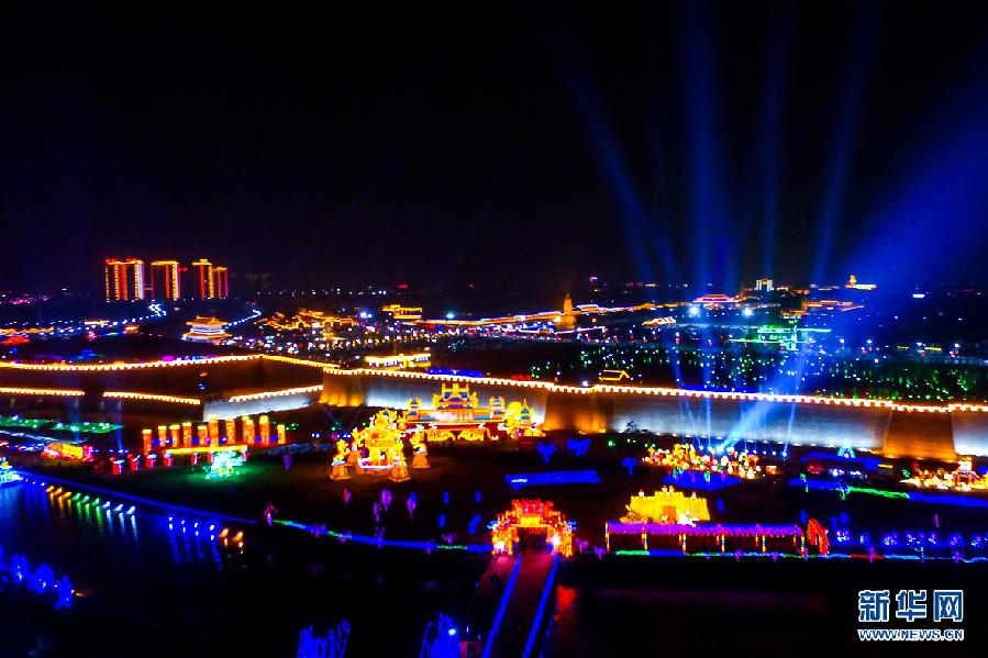 春节期间,2018石家庄新春游园灯会在河北正定璀璨绽放。在正定古城的南城门外,二十多个形态各异、色彩斑斓的巨形灯组将古城装扮的如诗如画。图为25日晚的灯会现场。新华网发 刘元摄