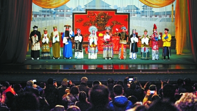 日前,在天津大剧院,京剧、河北梆子双演的《红鬃烈马》落幕后,演员们向台下聚集的观众致谢。《红鬃烈马》是由北京京剧院、北京河北梆子剧团联合带来的难得一见的京剧、河北梆子两下锅剧目,一出戏将京津冀三地紧紧联系在一起。将来,京津冀院团之间的合作剧目也将在天津大剧院上演。 记者 邓伟摄