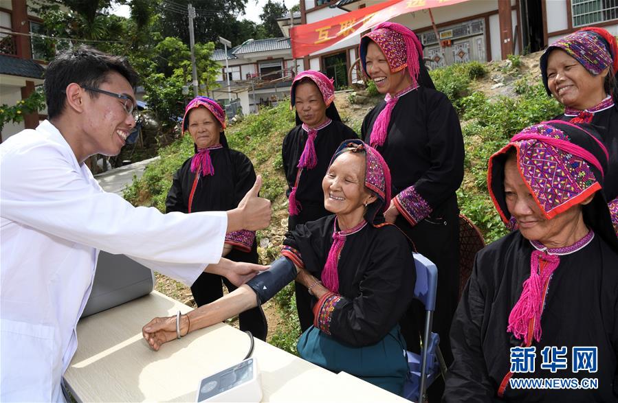 在海南省五指山市水满乡新村,水满中心卫生院的医护人员为群众测量血压(2017年8月15日摄)。