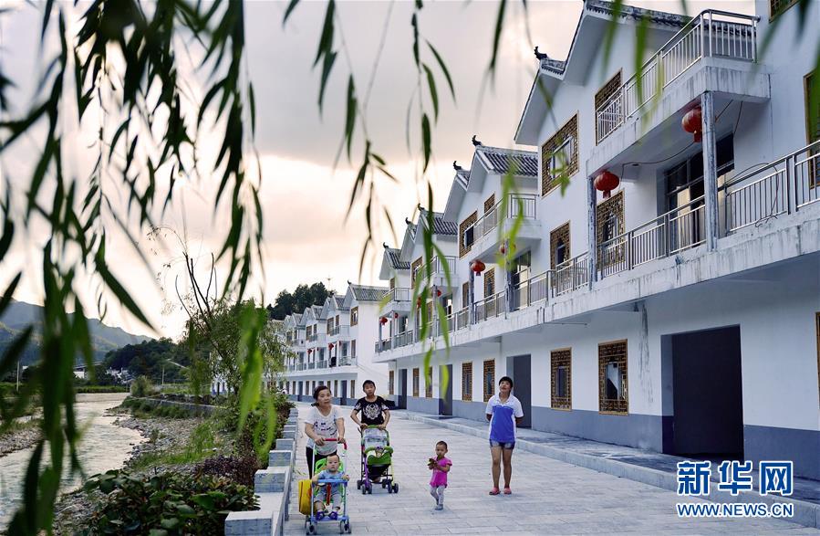 居民们在湖北省恩施土家族苗族自治州宣恩县高罗镇黄家河村易地扶贫搬迁安置点的新居前散步(2017年7月17日摄)。