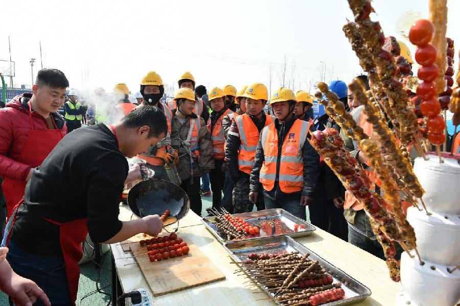 来自容城一家酒店的员工们集资购买了2万元的元宵,还拉来10台锅灶现场煮元宵;雄安当地的一家企业则购买了上百斤山楂,员工们自己动手制作成糖葫芦,为建设者们送上元宵节的祝福。