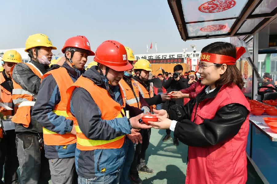 3月2日,雄安市民服务中心建设工地迎来了一个特别的元宵节,雄安新区当地企业、居民带来元宵、糖葫芦,为建设者们送上甜蜜的祝福。