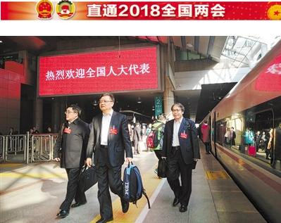3月2日,驻冀十三届全国人大代表集体乘坐高铁赴京参加十三届全国人大一次会议。图为河北代表团代表顺利抵达北京。 记者 赵海江 张 昊摄