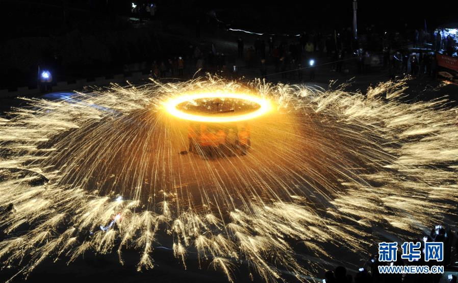 当日,滦平县火斗山乡大店子村民间艺人在村文化广场表演“抡花”,祈愿风调雨顺,国泰民安。“抡花”是当地一项传统民俗,被列入国家级非物质文化遗产名录。表演时,几名民间艺人将木炭和碎铁片一起放到挂在花架上的花筒中燃烧,再合力抡起花架,使花筒内升温,铁花飞溅,形成耀眼的光环,美轮美奂。