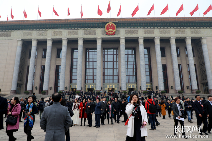 全国政协十三届一次会议开幕会结束,委员们走出会场。长城网 记者 高琳哲 摄