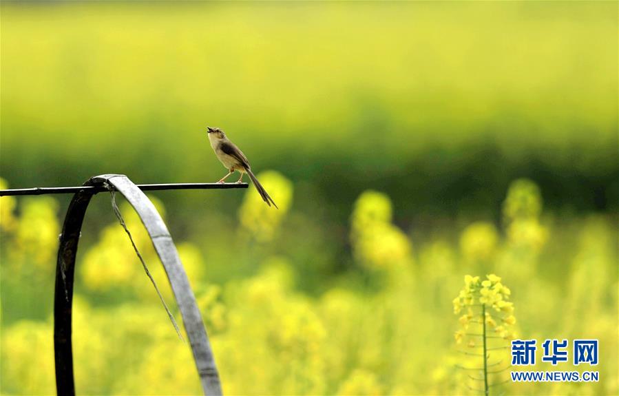 3月3日,一只小鸟在贵州省从江县的油菜花田中停留。