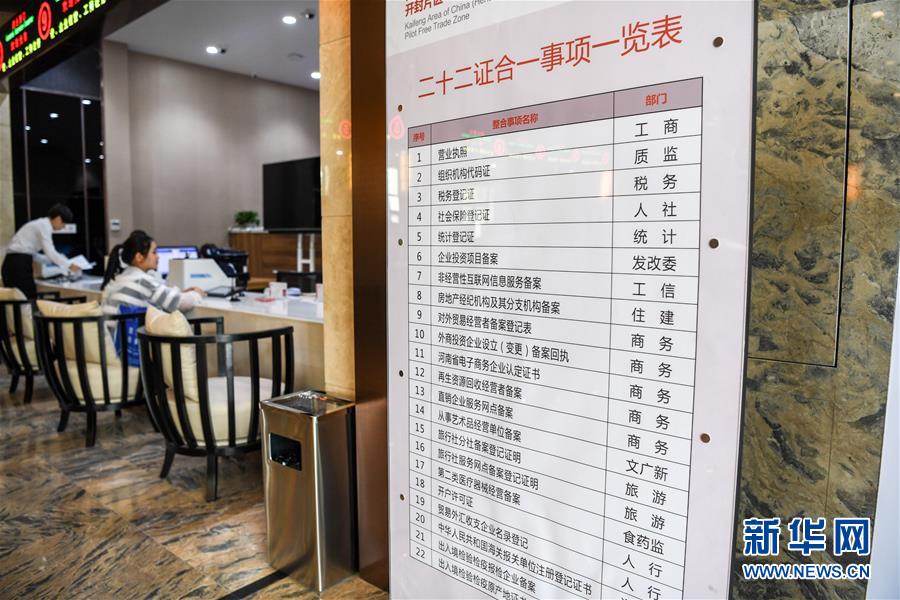 河南自贸区开封片区综合服务中心内的“二十二证合一事项一览表”(2017年6月16日摄)。为企业“松绑”、为群众“解绊”、为市场“腾位”——党的十八大以来,作为转变政府职能的突破口,一场简政放权改革在中国全面推开,蹄疾步稳。这场政府的自我革命,放真权,动真格,让企业和群众有了切切实实的获得感,极大地激发了市场活力和社会创造力。 新华社记者李博摄